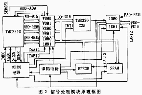 由于TMC2310是可编程的专用DSP器件,我们用一片TMS320C25 DSP器件与之配合,采用主从结构、并行处理方式,加上外围共享存储器阵列对等组成处理模块。TMS320C25除对TMC2310进行编程及控制外,还以并行运算处理的方式完成一些后续处理及辅助运算(如数据抽取、积分等)。整个电路系统采用模块化设计,便于调试及扩展。信号处理模块原理框图如图2所示。